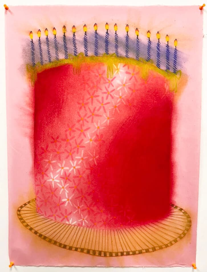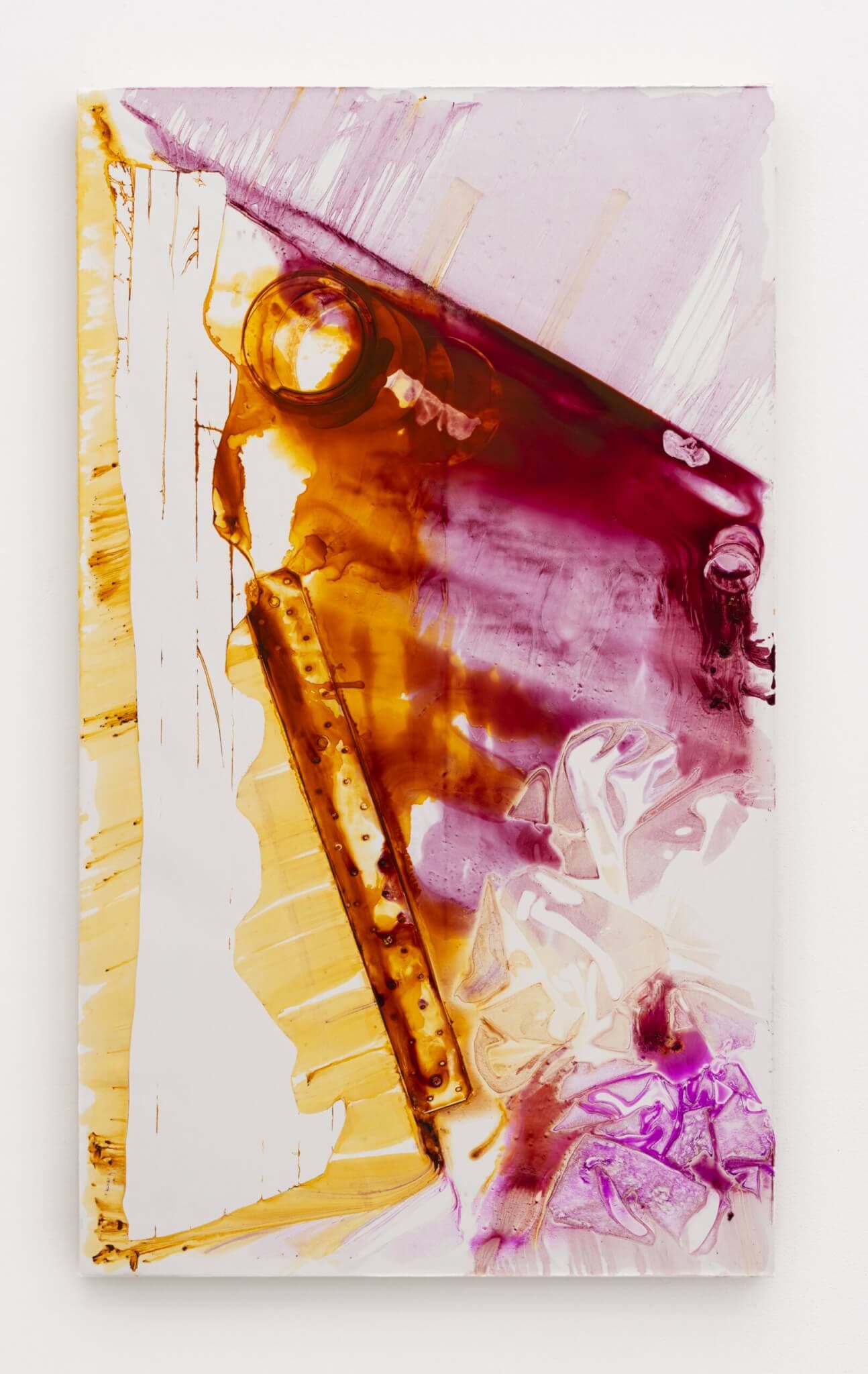 Brightening up the walls with vibrant color, Collins’s works on sanded canvas are developed through “silk-screening, pouring, sliding and printing with oil paint.” The artist moves everyday objects across the canvas to create glossy compositions. In the same exhibition space, Lejeune, who primarily works with machined metal and paper for their sculptures, offers up a series inspired by photos of the city sidewalk called witness marks. To create the work, Lejeune used different pulled sheets of paper layered and worked on in the wet studio and pressed into singular sheets. witness marks is a phrase that nods to “visual indicators of the fabrication processes” and is also a term used in surveying, both of which relate to location. Using a variety of media forms—from poetry to TV to signage around Los Angeles—Arzeta’s lyrical drawings are studies in color and pattern. Arzeta’s show, Green and Violet Blue—the title of which comes from the 1988 song “Love is a Sign” lyrics—aspires to “expand a viewer’s experience of recollection, longing, and empathy.”