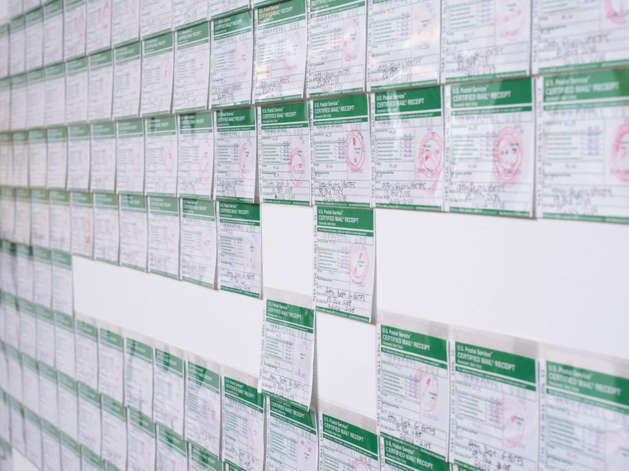 Nicole Wilson is known for her deeply conceptual, process-intensive artworks, and National Debt Project is no exception. It began almost fifteen years ago (after the 2008 financial crisis), when Wilson began writing one letter every day to the US Department of the Treasury, dispatched with change she found on the streets and in her pockets, effectively building a national debt relief fund from discarded/lost pennies. It’s a gesture that’s both modest and grand, and meaningful for its attempt to address an issue that feels astronomically larger than any one individual. For the project’s first-ever gallery presentation, Praise Shadows will present a monumental installation of the accumulated 5,479 mail receipts from Wilson’s letters, porcelain sculptures that reinterpret the concept of a “piggy bank,” and both in-person and virtual participatory elements, including a website that allows anyone to pitch donations and receive receipts in the form of NFTs.