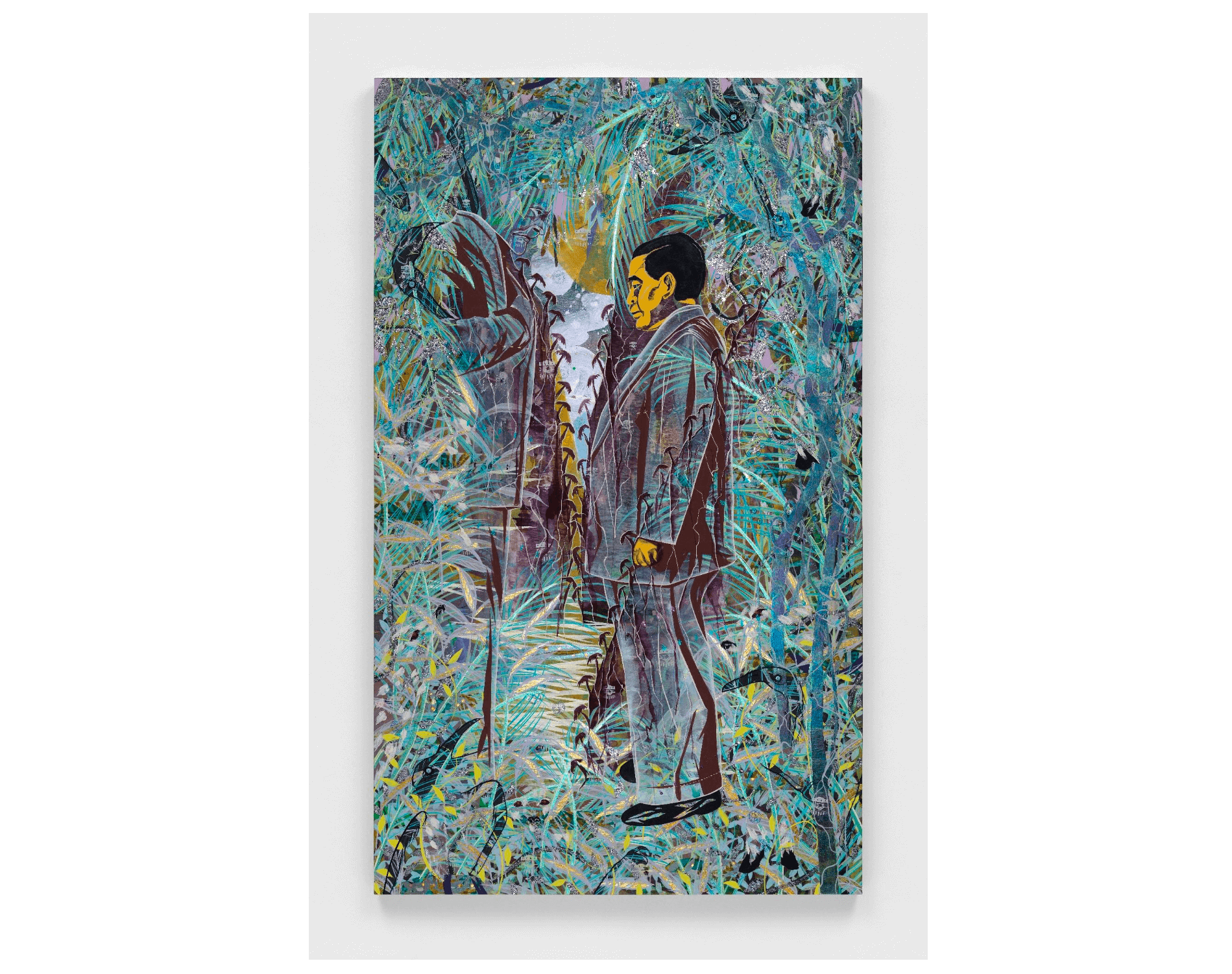 Tammy Nguyen, Ralph Waldo Emerson, 2023. Watercolor, vinyl paint, ink, screen printing ink, pastel, and metal leaf on paper stretched over panel, 100″ x 60″ (254 x 152.4 cm). Courtesy the artist and Lehmann Maupin, New York, Hong Kong, Seoul, and London. Photo by Mel Taing. 2023 © Tammy Nguyen.