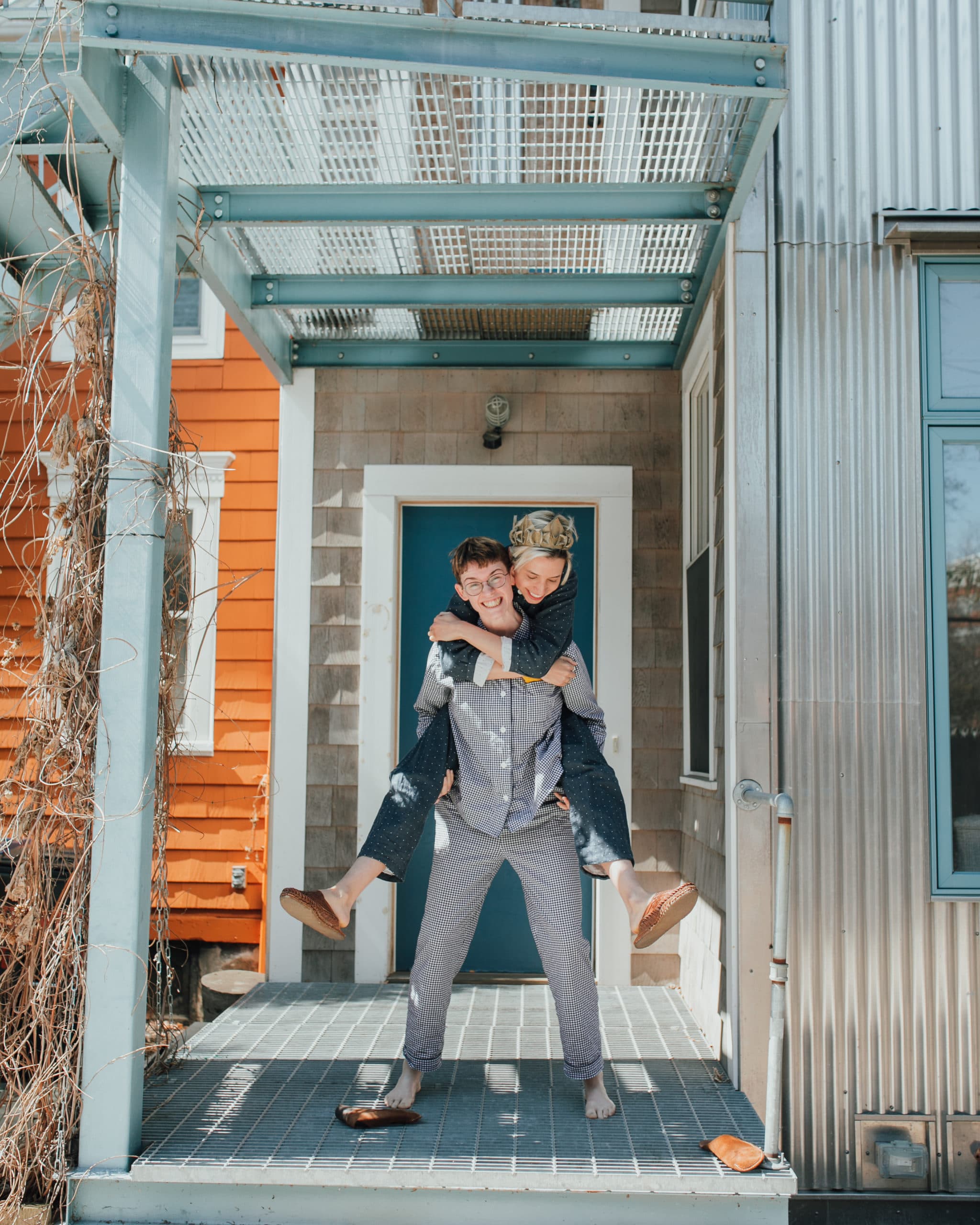 Ally Schmaling, Queerentine portraiture series, 2020, courtesy of the artist. “I asked them all one question: What tiny moments of joy have you found in all of this?” Shana (she/her) & Stacy (she/her), Leah (she/her) & Jahna (she/her) “Almost every night at 6, we meet for porch time with our neighbors. They’re on the 3rd floor, we’re on the 2nd. Sometimes it’s sad, sometimes it’s silly – it’s a way to check in on each other, but, you know, it draws out the whole neighborhood too. It’s like this visible moment of humanity on display.”
